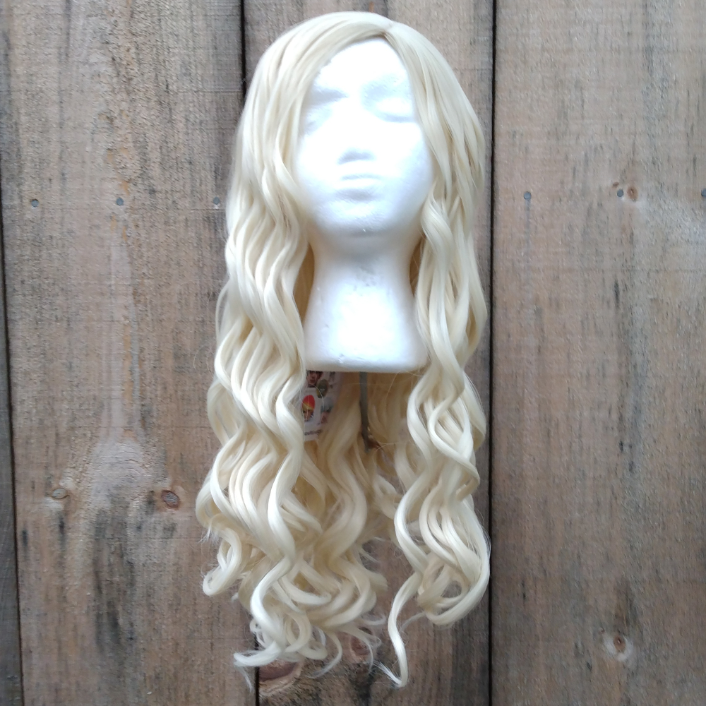 This pale blonde wig has gentle curls and is made of a sleek heat-resistant (up to 300°F/148°C) synthetic fiber. Length is 26" (66 cm) from the crown. Side skin cap part wig. Part of the "bombshell blond" color match. Works for Mt. Lady from Boku No Hero Academia.