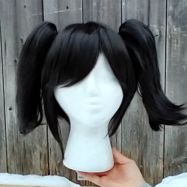This sweet little wig and it's two jaunty little ponytails make for a very cute and customizable look that looks great with hats, bows, and that dress you got. Made of a sleek heat-resistant (up to 300°F/148°C) synthetic fiber. Length is 7" (18 cm) from the crown on the base wig, while the tails are 12" (30 cm) long. Small skintop wig. Part of the "sugoi black" color match.