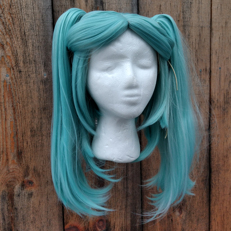 This base of this pale teal wig comes with its bangs styled up and away from the face, longer pieces framing the face, and two clip-on ponytails (18" (46 cm) long) meant to clip over the swept-up bangs for added height.Made of a sleek heat-resistant (up to 300°F/148°C) synthetic fiber. Length is 17" (43 cm) from the crown. Center skin cap part wig. Works for Rebecca from Cyberpunk.