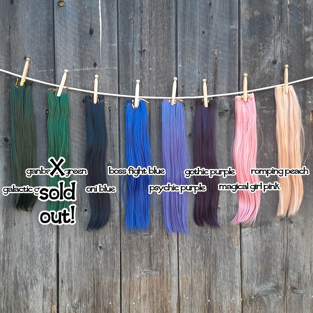They're available in "sugoi black", "silver medal", "antagonist white", "moonlight white", "fatality white", "determination brown", "protagonist brown", "serious business brown", "toast brown", "sorcery golden brown", "rowdy blond", "big big blond", "friendship blond", "mallorn blond", "bombshell blond", "pirate blond", "stalwart blonde", "intensity orange", "spicy ginger", "red oni", "sword sword green", "galactic green", "boss fight blue", "oni blue", "boss fight blue", "magical girl pink", "romping peach", "gothic purple", and "psychic purple".